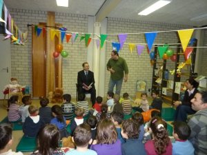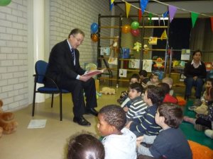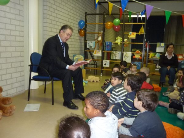 Men wilde graag dat prinses Maxima voorlas tijdens het nationale voorleesontbijt. Wij wilden echter de meest inspirerende man van Rotterdam: burgervader Ahmed Aboutaleb. In mijn ogen het lichtend voorbeeld voor veel van onze leerlingen. Aboutaleb kwam als 15 jarige vanuit Marokko naar Nederland. Sprak de taal niet en bestuurt nu de grootste havenstad van Europa. “Kent u Obama?” vroeg een van onze leerlingen uit groep 5. Aboutaleb vertelde het inspirende verhaal van twee journalisten die een fotootje bekeken waarop een Afrikaans jongetje stond met een vuil t-shirtje aan. Niemand had kunnen bevroeden dat het Afrikaanse jongetje de president van een wereldmacht zou worden. “School is belangrijk voor jullie,vergeet dat nooit. Leer de taal en maak wat van je leven”. Heeft Obama gedaan, Aboutaleb ook. En dankzij de dames van de werkgroep leesbevordering is dit weer eens op een andere manier onder de aandacht gebracht van onze kinderen.