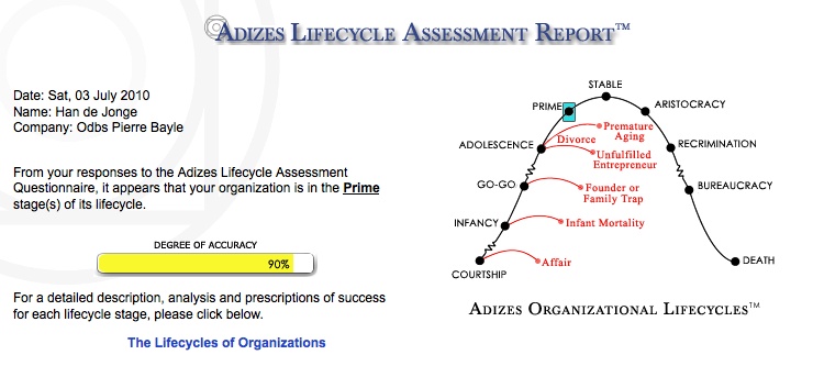 Flirt, Peuter, Go-Go, Adolescentie, Bloei, Ouderdom, Aristocratie, Bureaucratie en Overlijden. Elke fase kent zijn eigen unieke valkuilen en uitdagingen. Adizes beschrijft daarnaast een aantal afwijkingen  die  kunnen leiden tot vroegtijdige neergang van de organisatie.